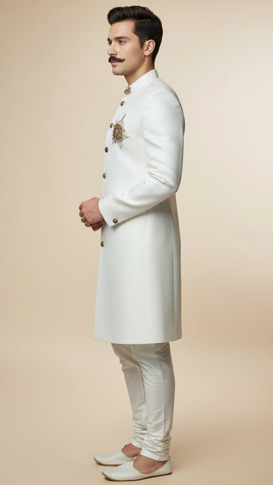 Ivory Textured Indo-Western Sherwani with Antique Buttons & Hand-Embroidered Crest