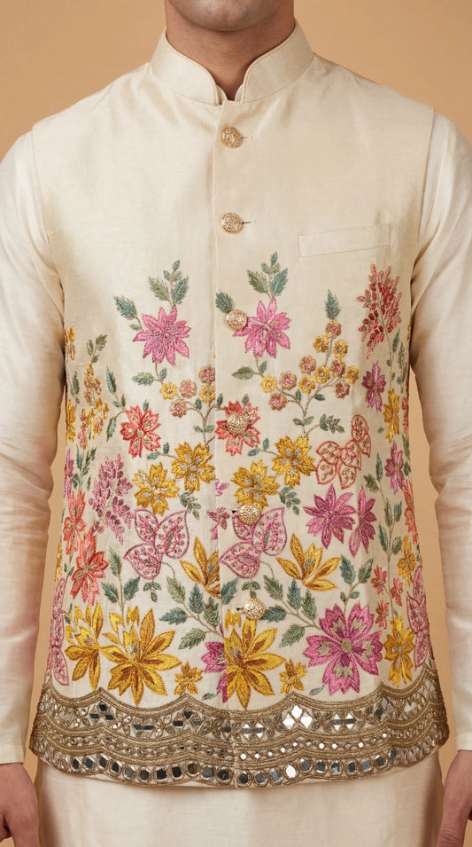 Cream Floral Embroidered Waistcoat for Men | Dresswala NX