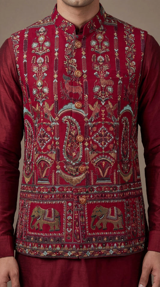 Maroon Embroidered Festive Waistcoat for Men | Dresswala NX