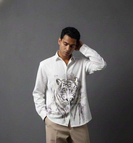 White Club-Wear Shirt with Artistic Tiger Print | Dresswala NX