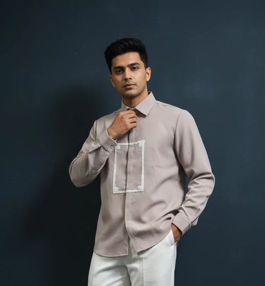 Taupe Club-Wear Shirt with Beaded Frame Motif | Dresswala NX