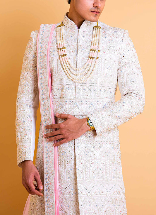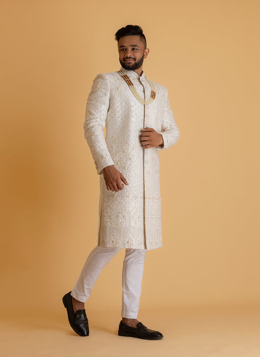 Pearl White Sherwani set in Lucknowi embroidery