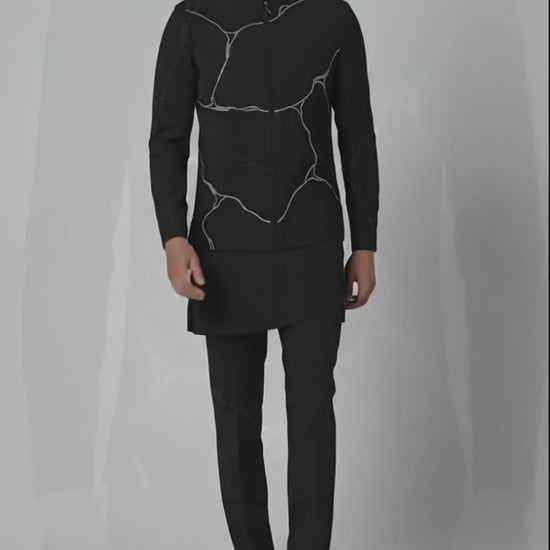 Discover the Black Thread-Embroidered Kurta Jacket Set with intricate tonal detailing and a modern silhouette, perfect for weddings, receptions, and festive celebrations.
