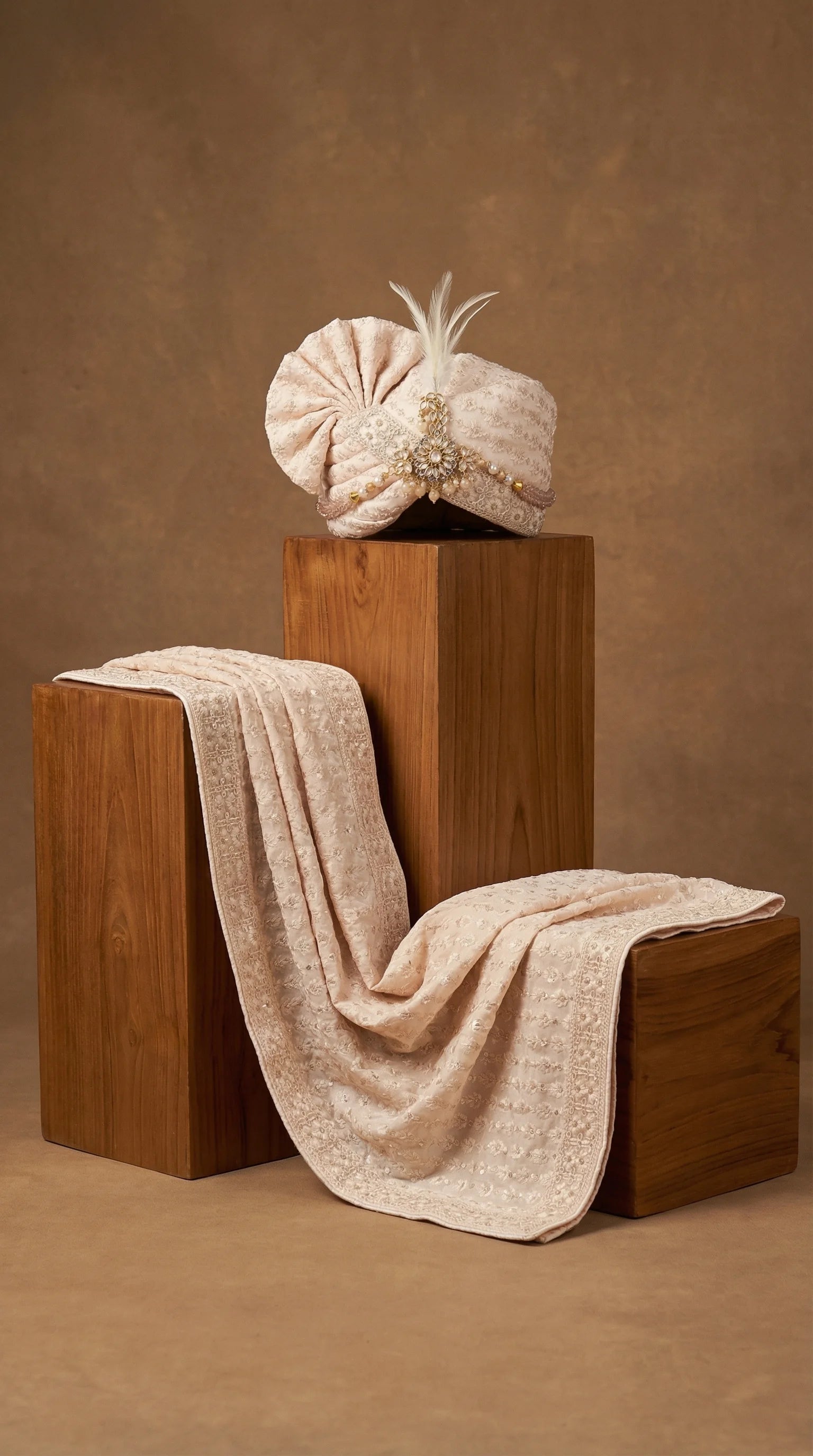 Shop Rangraj Ivory Pearl Raj Groom Safa Set with embroidered stole and pearl kalgi. Premium men’s wedding pagdi by Dresswala NX.