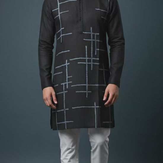 Upgrade your ethnic style with this men’s black linen kurta, featuring contemporary blue geometric line detailing and a clean mandarin collar. Lightweight, breathable linen with a modern straight fit—ideal for festive evenings, celebrations, and statement ethnic looks.
