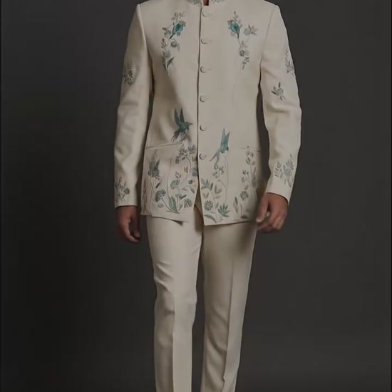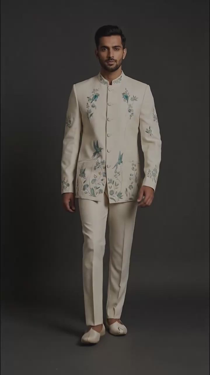 Shop an ivory embroidered bandhgala (jodhpuri) suit with delicate floral & bird detailing, perfect for weddings, engagements & festive occasions at Dresswala NX.