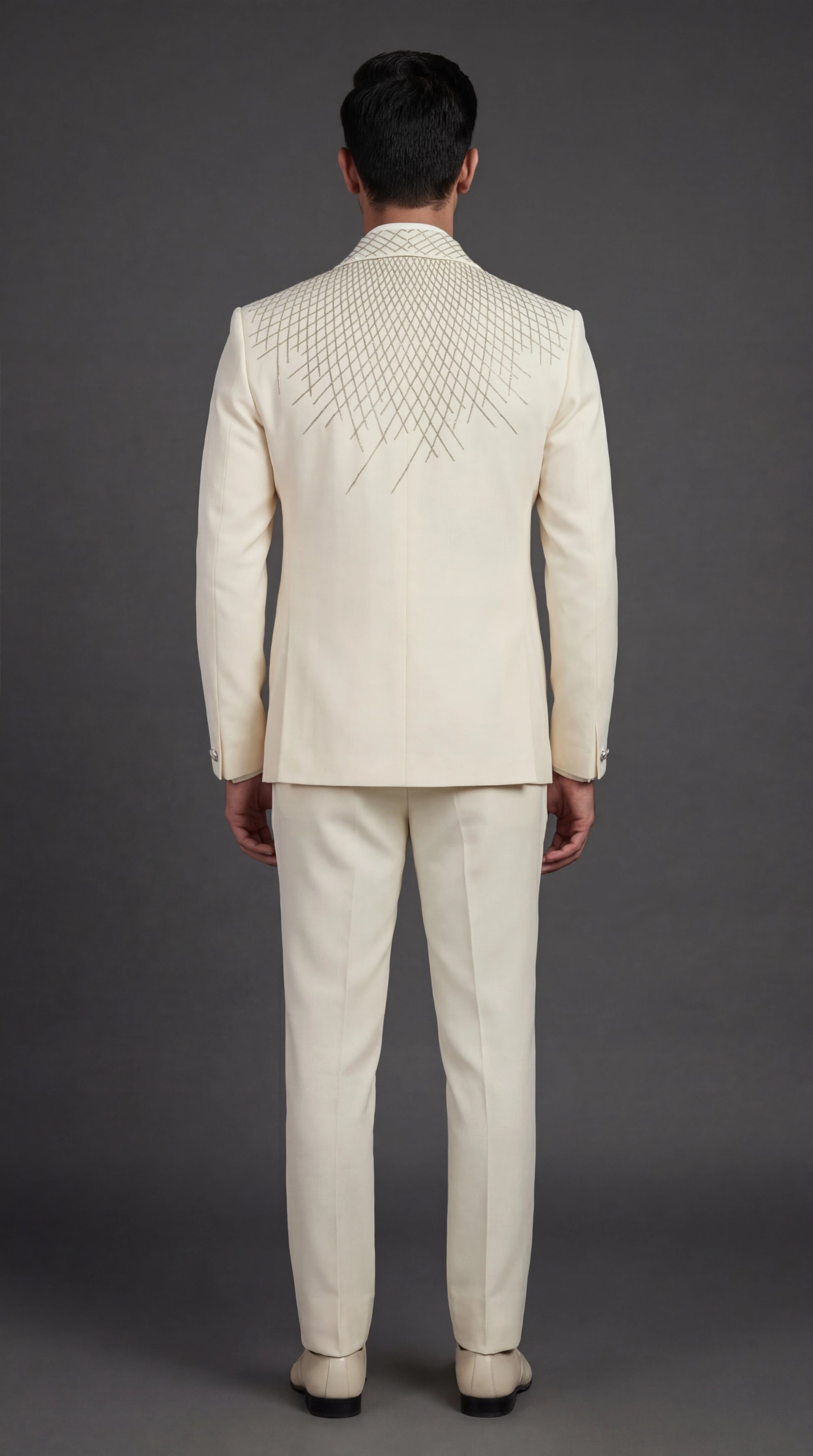 Elevate your formal style with this ivory embroidered tuxedo suit for men, designed for timeless elegance and modern sophistication. Featuring an intricately patterned geometric thread embroidery across the jacket, this suit delivers a refined statement ideal for weddings and grand celebrations.