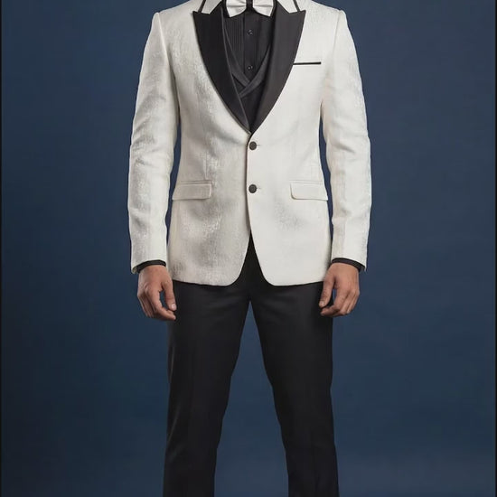 Step into refined elegance with this ivory white tuxedo suit for men, designed for grooms and gentlemen who want a bold yet sophisticated presence. Featuring a textured ivory blazer with a contrasting black shawl lapel, this tuxedo balances modern luxury with timeless formal style.