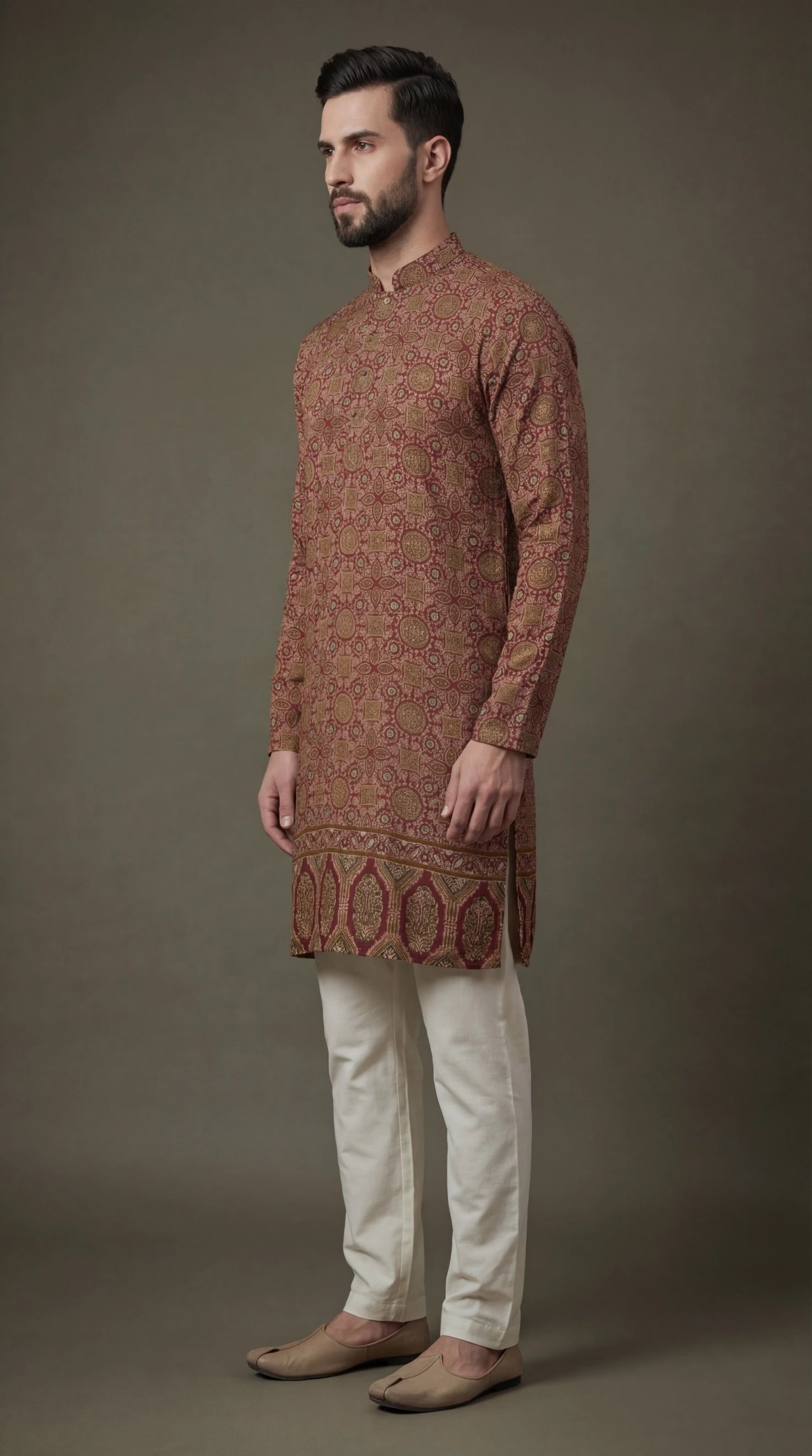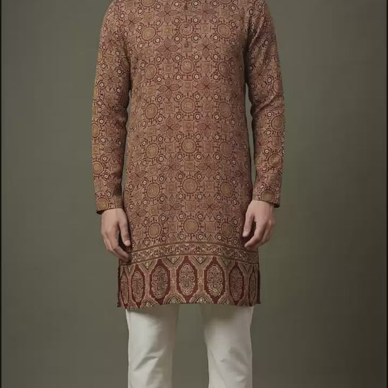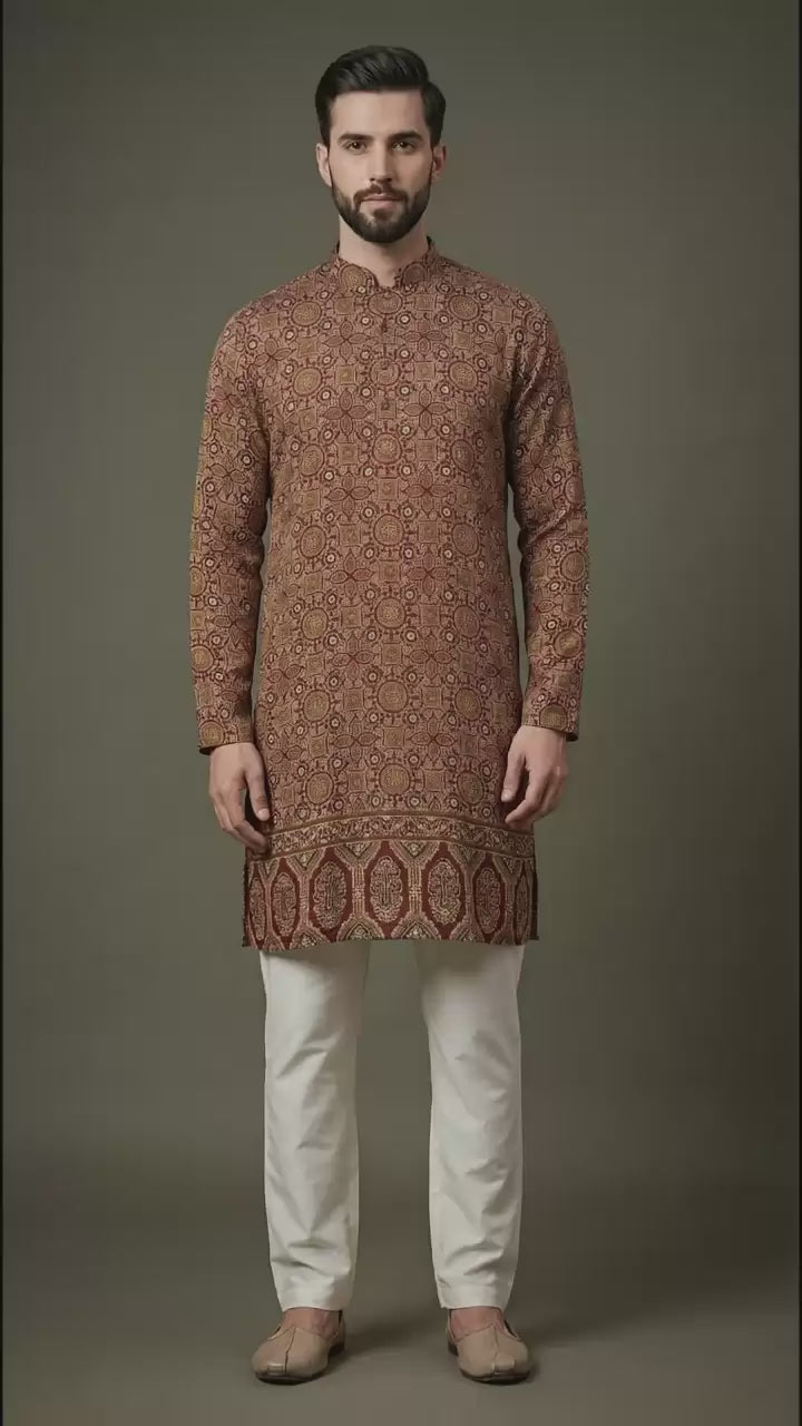 Classic maroon kurta with all-over traditional print and statement border detailing. Perfect for weddings, festive functions, and ethnic occasions—pair with ivory churidar or pyjama.