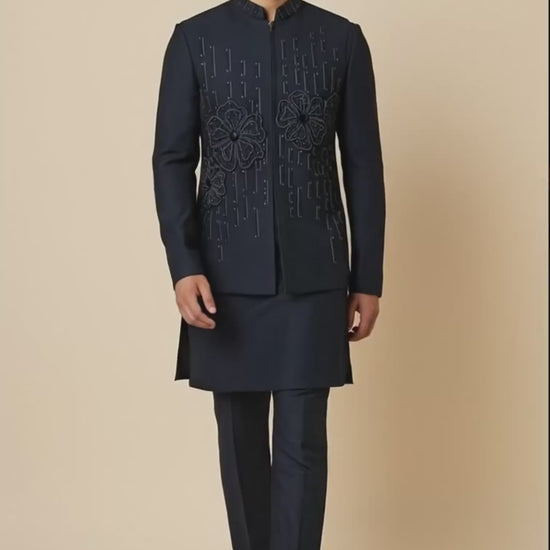 Discover the Navy Blue Thread-Embroidered Kurta Jacket Set featuring intricate detailing, premium fabric and a modern silhouette, perfect for weddings and festive events.