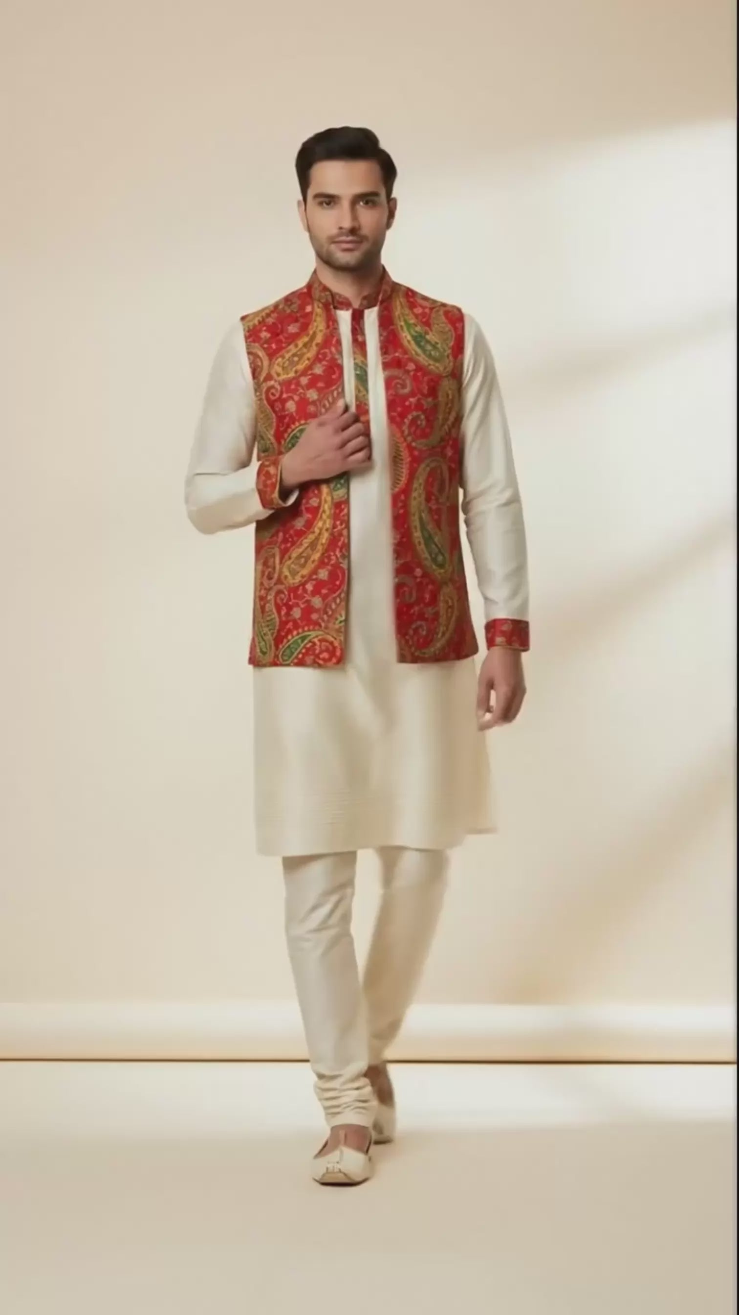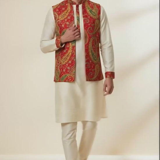 Explore the Red Paisley Printed Nehru Jacket Set paired with a classic cream kurta and churidar, perfect for festive occasions, weddings, and traditional celebrations.