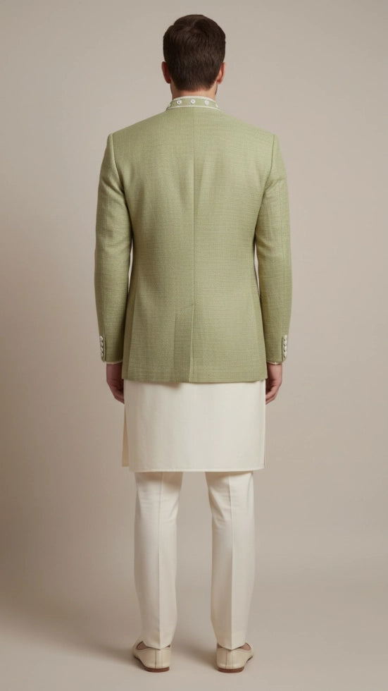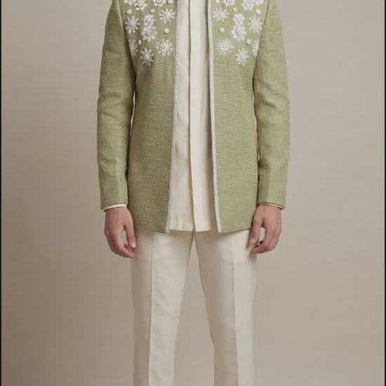 A sage green bandhgala jacket with white floral embroidery, paired with an ivory kurta and trousers, fresh, premium, and perfect for haldi, daytime weddings, and festive events.