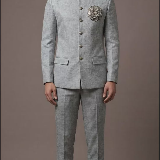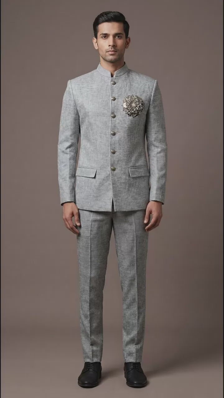 Sharp steel-grey bandhgala suit with a statement brooch detail and clean tailored finish, perfect for receptions, engagement nights, and formal weddings.