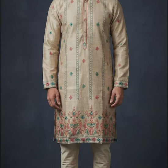 Shop a beige embroidered kurta set for men at Dresswala NX, subtle multicolour motifs with an elegant festive finish. Perfect for weddings, pooja & celebrations.
