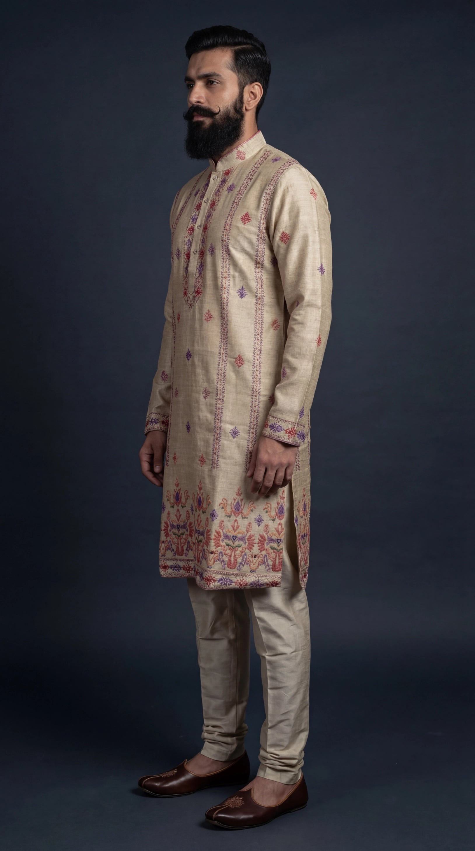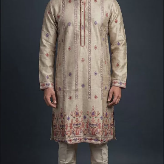 Shop a beige embroidered kurta set for men at Dresswala NX, subtle multicolour threadwork with elegant border detailing. Perfect for weddings & festive occasions.