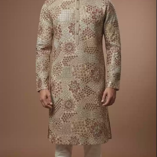 A premium beige brocade kurta set featuring an intricate blend of floral and geometric woven patterns. Paired with classic ivory churidar pants, this elegant outfit is perfect for weddings, festive occasions, engagement ceremonies, and traditional family events.