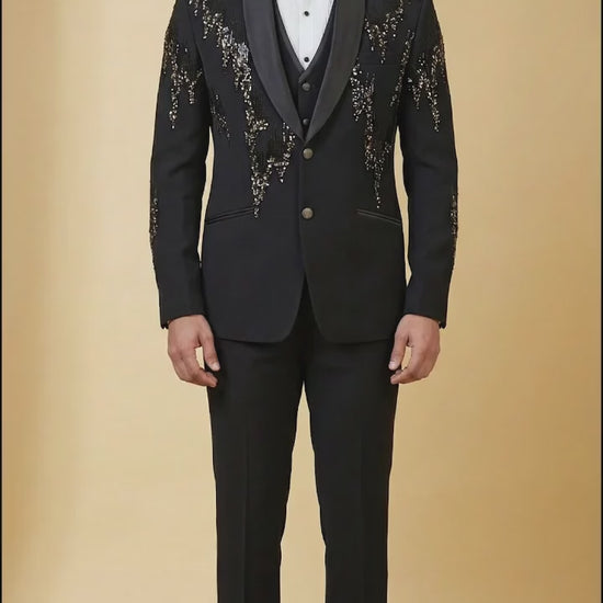 Premium black party suit with gold shimmer detailing, crafted for cocktail nights, receptions, and high-fashion celebrations.