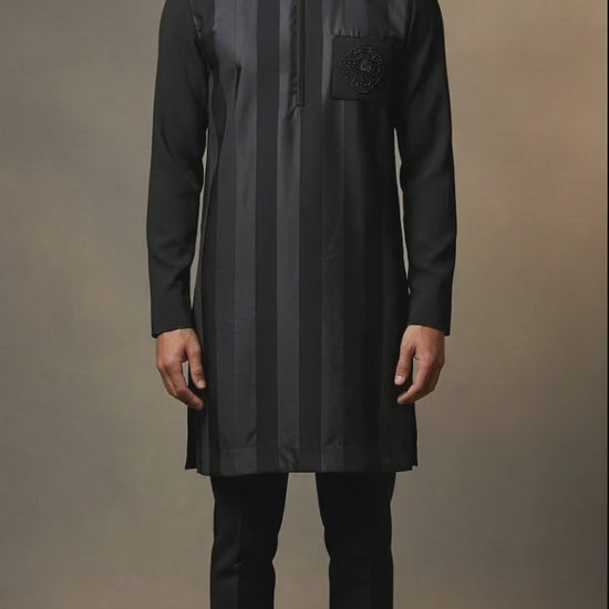 Shop a black striped kurta set for men at Dresswala NX-sleek, minimal, and perfect for festive nights, weddings, and special occasions. Premium fit & finish.