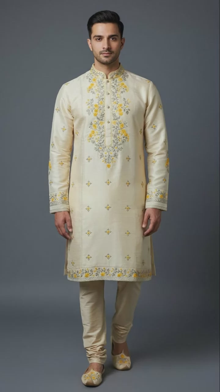 Embrace classic elegance with this cream embroidered kurta set from Dresswala NX. Designed with intricate yellow and grey threadwork, premium fabric, and a refined tailored fit, this outfit is perfect for weddings, haldi ceremonies, festive events, and cultural celebrations. Shop high-quality ethnic menswear with fast delivery and great pricing.