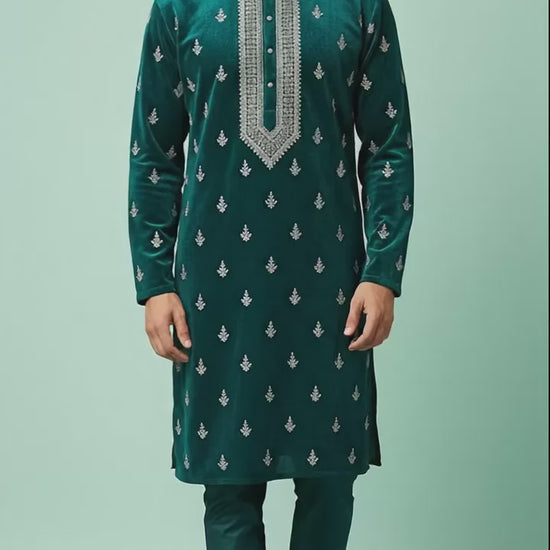 A luxurious emerald green velvet kurta set featuring delicate silver thread embroidery and an exquisitely detailed neckline. Paired with matching churidar pants, this premium ethnic outfit is perfect for weddings, receptions, festive celebrations, sangeet nights, and winter events.