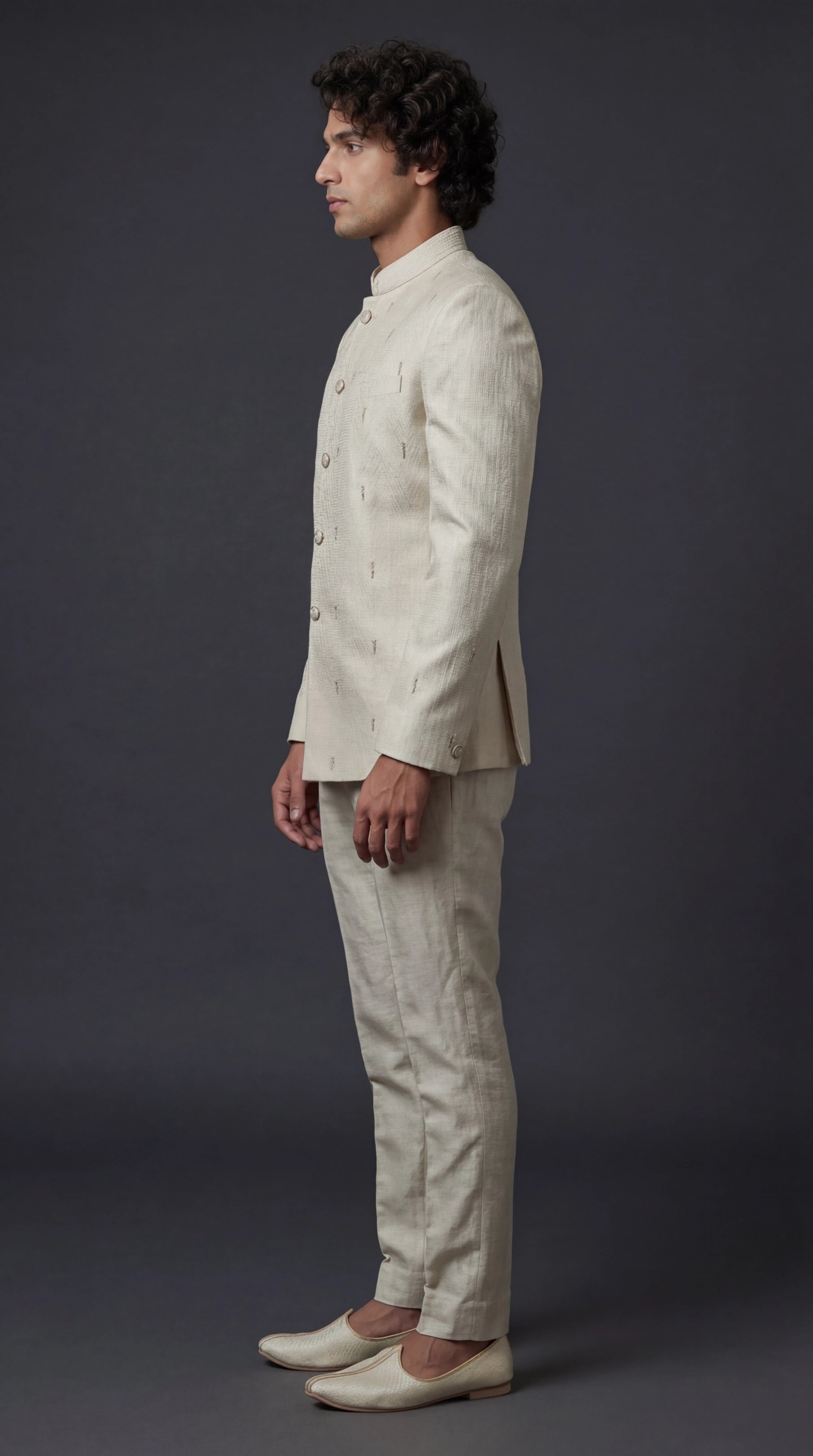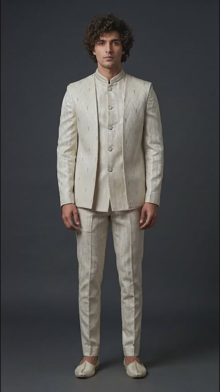 Shop an ivory bandhgala suit for men at Dresswala NX, classic Nehru-collar tailoring with a premium textured finish. Perfect for weddings & receptions.