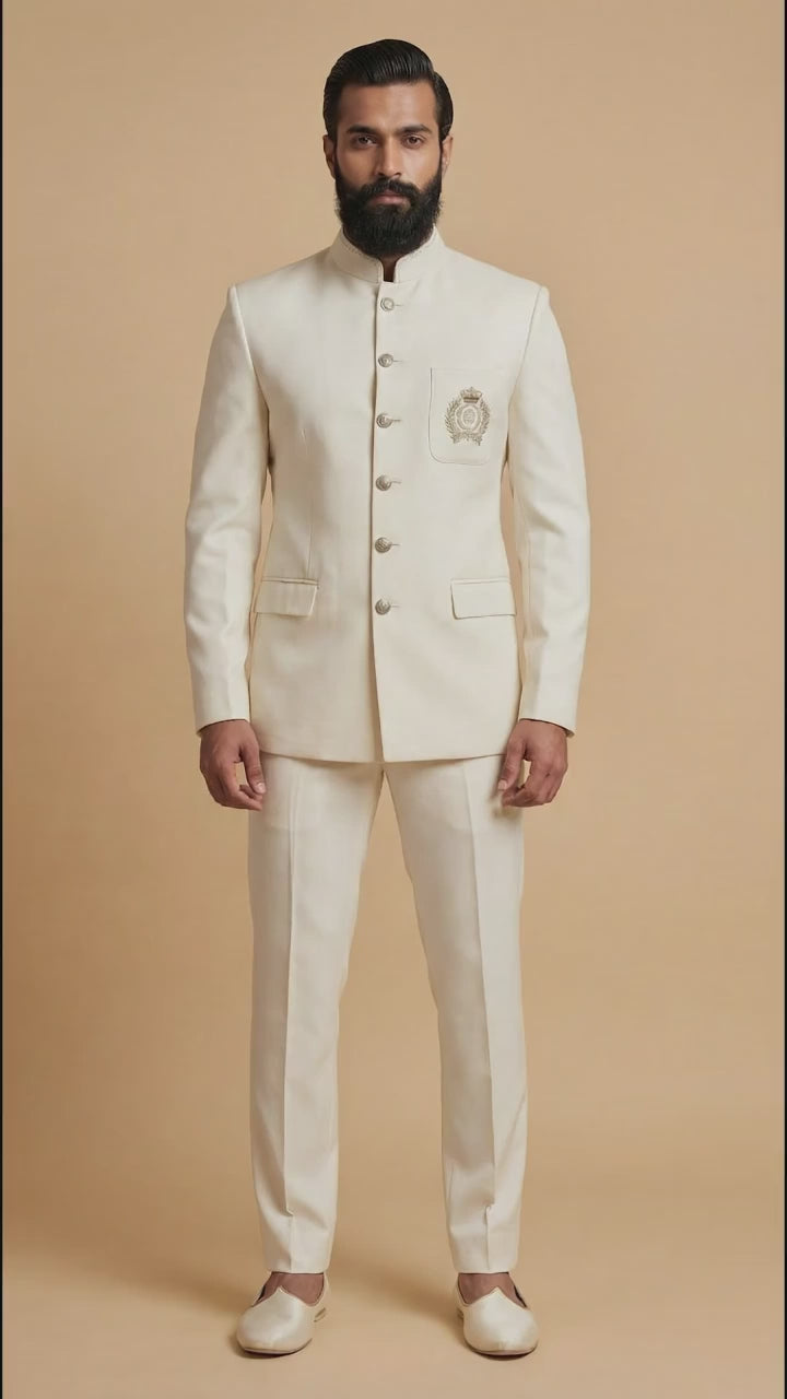 Shop an ivory bandhgala suit for men at Dresswala NX, clean silhouette with regal crest detailing. Perfect for wedding functions, receptions & engagement looks.