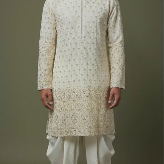 A premium ivory kurta set featuring delicate all-over embroidery with a royal border design, paired with a classic Patiala-style salwar. Perfect for weddings, receptions, festive ceremonies, mehendi, haldi, and elegant daytime functions. Offers a timeless ethnic look with rich detailing and luxurious craftsmanship.