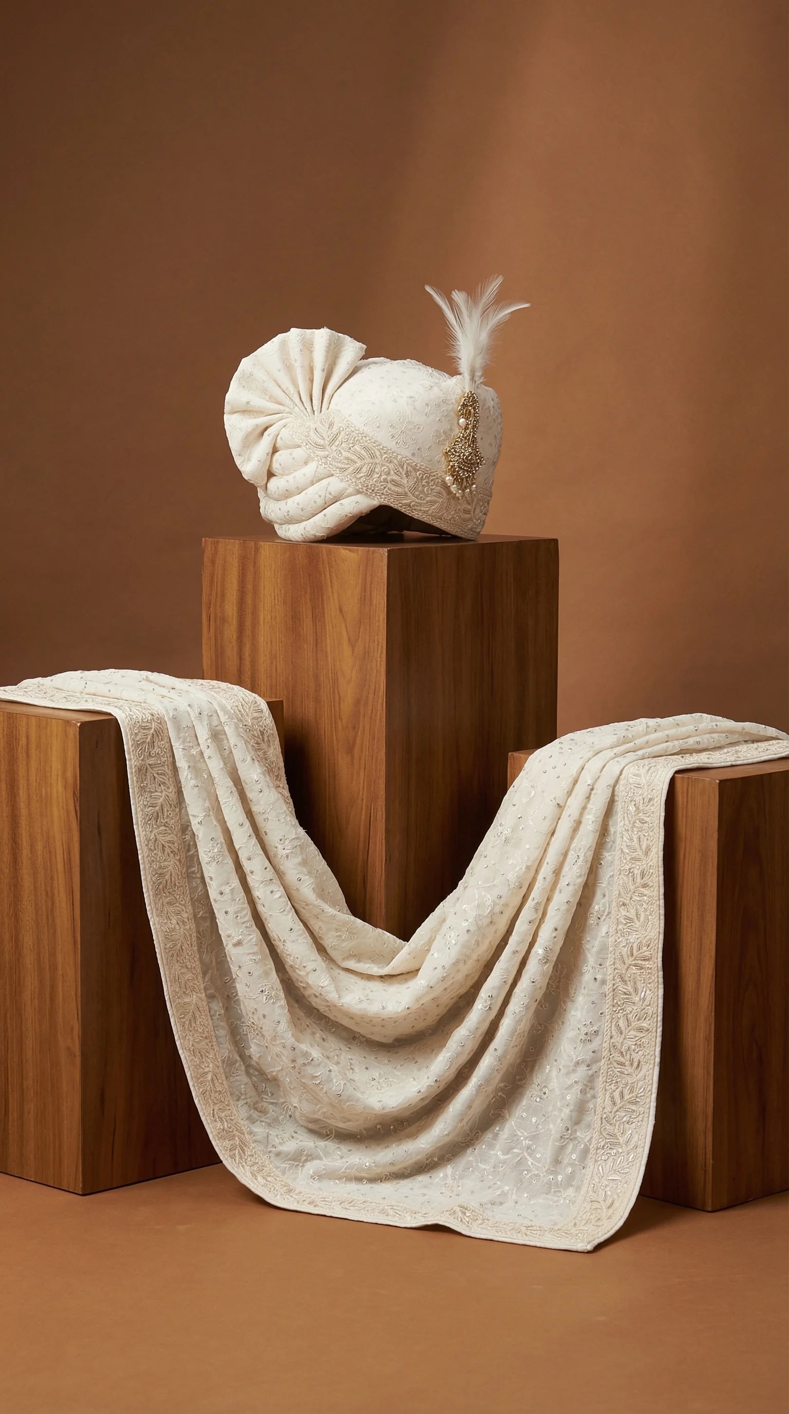Shop Rangraj Ivory Heirloom Groom Safa with matching stole and pearl kalgi. A timeless men’s wedding pagdi by Dresswala NX.