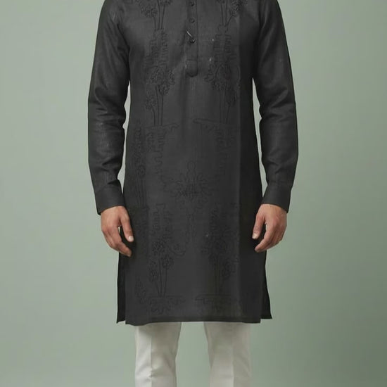 Elevate your ethnic wardrobe with this men’s black linen kurta, featuring refined tonal embroidery and a sleek mandarin collar. Made from breathable linen with a straight, modern fit, it’s perfect for festive evenings, celebrations, and elegant traditional wear with a minimal, powerful look.