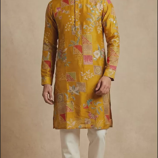 Men’s Mustard Patchwork Floral Kurta | Festive Statement Wear – Dresswala NX