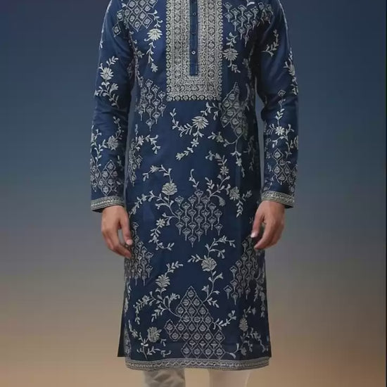 Make a royal style statement with this navy blue heavy embroidered kurta set from Dresswala NX. Featuring intricate silver threadwork across the chest, sleeves, and body, this premium ethnic outfit is perfect for weddings, receptions, sangeet nights, and festive occasions. Crafted for elegance, comfort, and timeless charm.