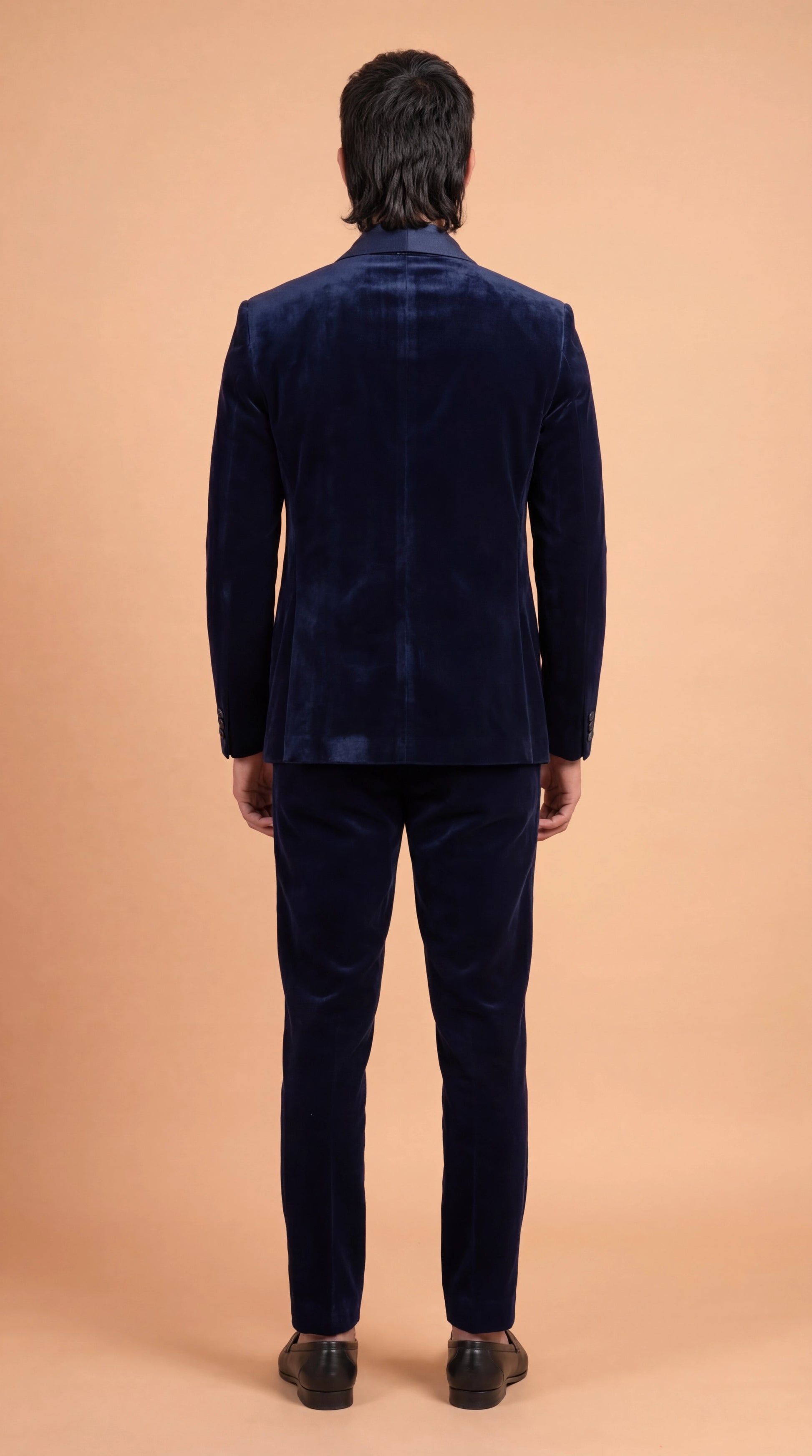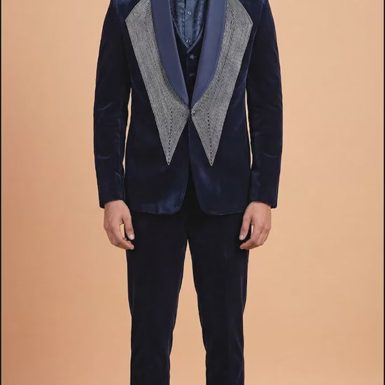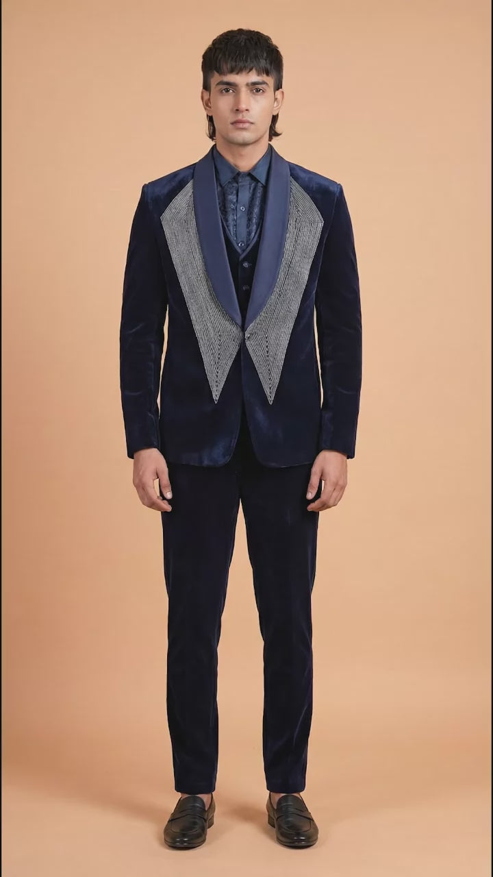 Premium midnight navy velvet suit with contrast lapel detailing, crafted for elite parties and statement evenings.