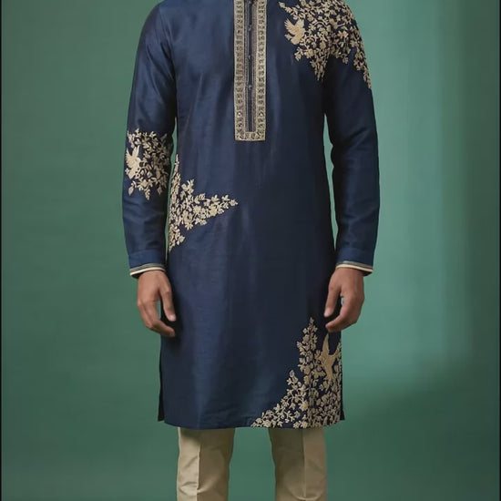 Shop a navy blue embroidered kurta set for men at Dresswala NX, premium threadwork on shoulder and hem for a royal festive look. Perfect for weddings & receptions.