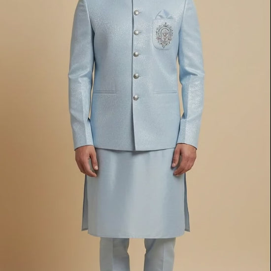Pastel Blue Textured Kurta Set with Embroidered Bandhgala Jacket – Sophisticated Wedding Menswear