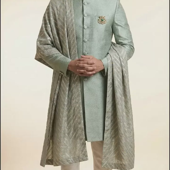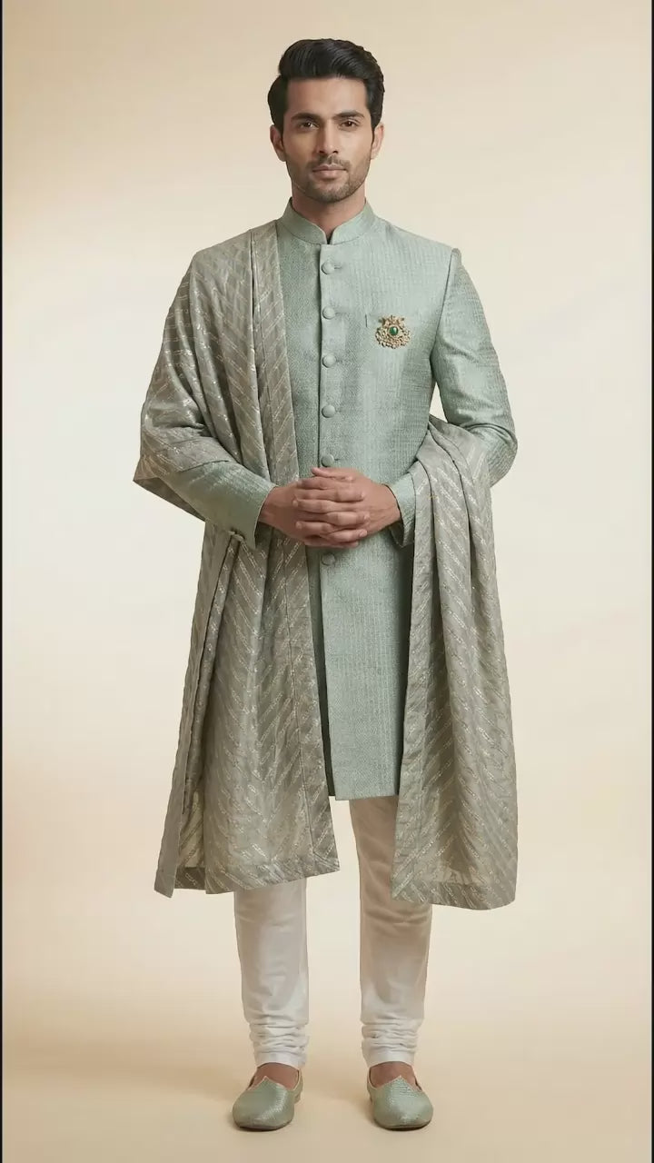 Premium Sage Green Indo-Western with patterned dupatta and antique brooch. Perfect for weddings and elegant celebrations.